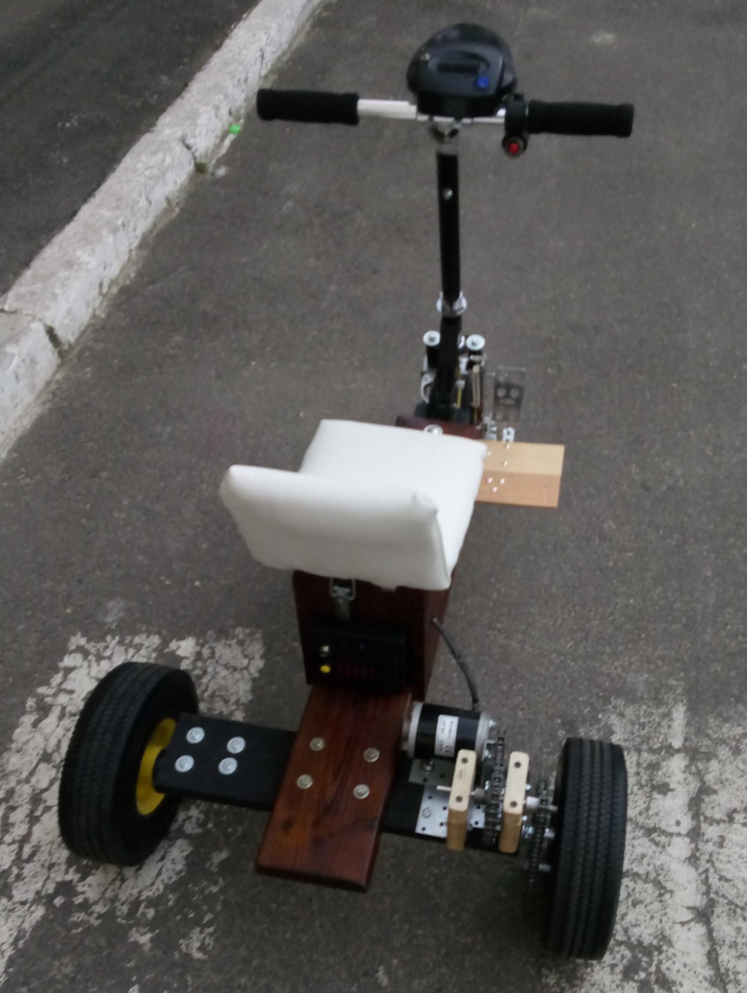 Использована комбиация части старого самоката, деревянный брус и дощечки, кож.зам. со старого дивана, самодельная электроника, двигатель на 120 ватт на 12 вольт, батарея из четырёх сдвоенных LiFePO4,