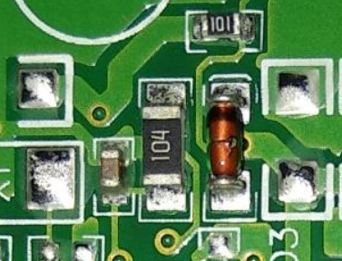 Вот этот резистор, обозначенный 104, тоже не прозванивается. Но может он много килоОмный.