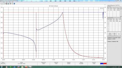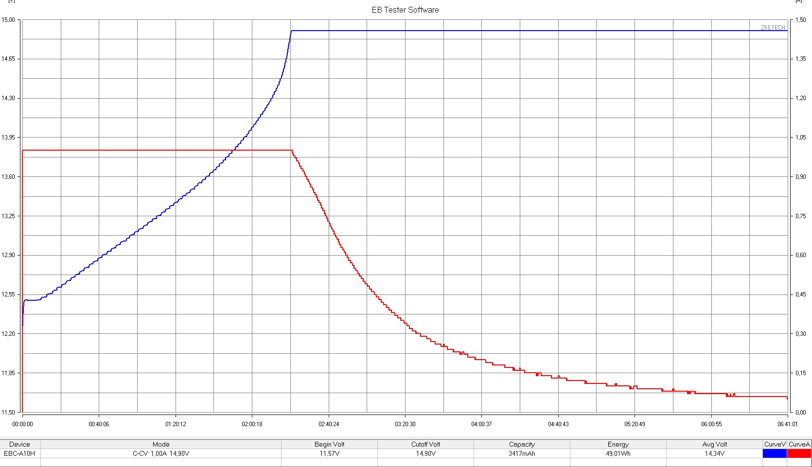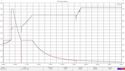 Как видим смена способа заряда дала падение ёмкости, последний заряд провёл током 0,34С до 14,9в.