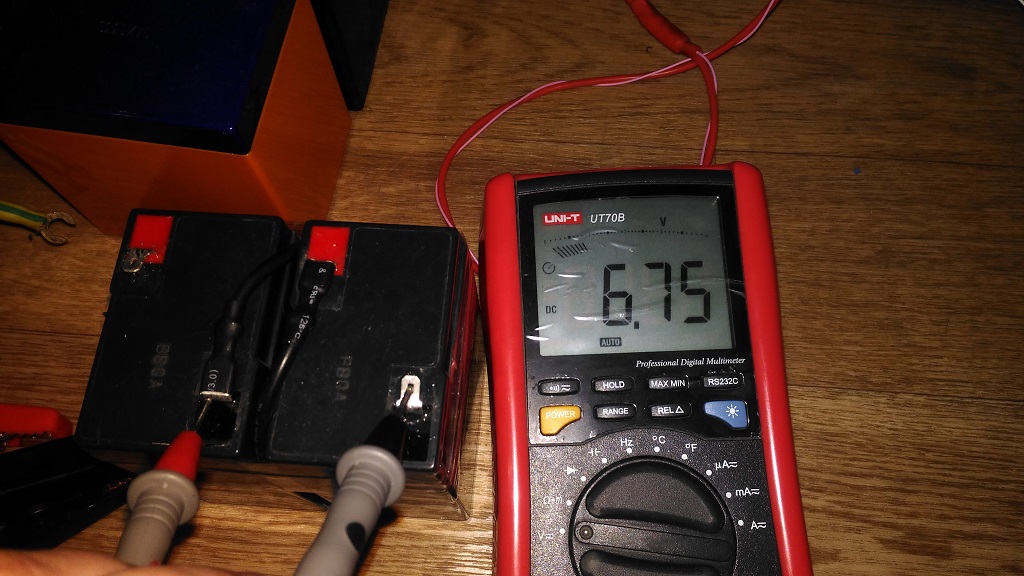 Теперь пред тем как будет ещё один разряд начинаем выяснять причину падения ёмкости, для начала замер на средней точке акб после заряда, видим там [b-b]6,74в[/b-b] и [b-b]6,75в[/b-b], всего [b-b]10мв[/b-b] разницы.