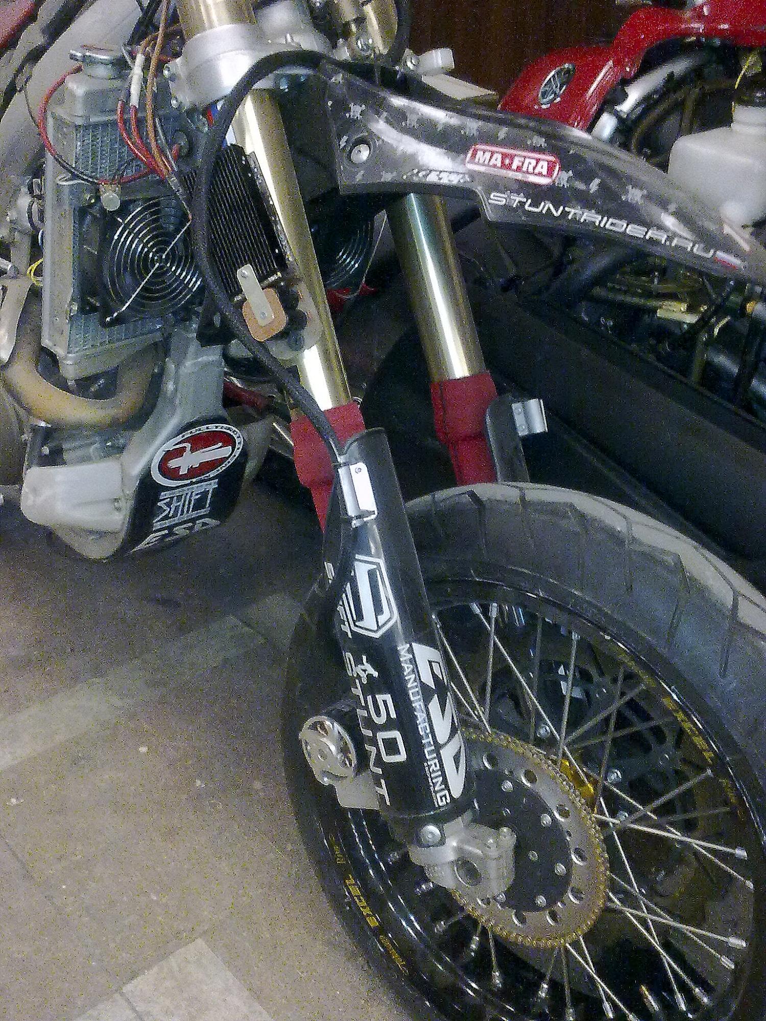 В стантрайдинге есть такой трюк, называется "стоппи", когда от резкого торможения передним колесом мотоцикл поднимает заднее колесо до баланса и продолжает движение на одном переднем колесе.  Сложность обучения заключается в том, что при слишком сильном торможении мотоцикл переворачивается через переднее колесо и нет никаких способов это исправить.  Я для исправления такого положения, всегда приводящего к жесткому падению, дополнил мотором в 3 квт переднее колесо, которое исправляет ошибку.