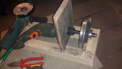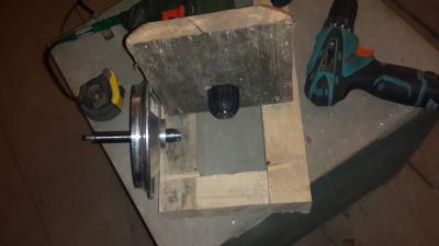 Для того что бы зажать такую толстую ось в маленькую дрель пришлось нарезать немного резьбы и вкрутить болт М8 и срезать ему шляпку.