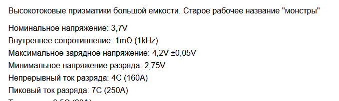 [user]xdforce[/user],  чем больше читаешь твои сообщения в разных темах, тем яснее осознаешь, что пишешь ты свои сообщения от балды, от нефиг делать, несешь всякую хрень. Вот и в этой теме пишешь ахинею полную, хочешь получить ток 150-200А, а ячейки смотришь с максимальным продолжительным током на 43А, таких ячеек в одну параллель нужно, как минимум 5, напряжение батареи какое, 48-60в, значит еще умножим на 14 или 16, итого получаем 70-80 ячеек, вес одной ячейки 340гр, вся батарея будет весить 25-27кг, а стоить 72 000 руб. Без стоимости БМС и работы по её сборке. По ходу у тебя правильная подпись на аватарке.