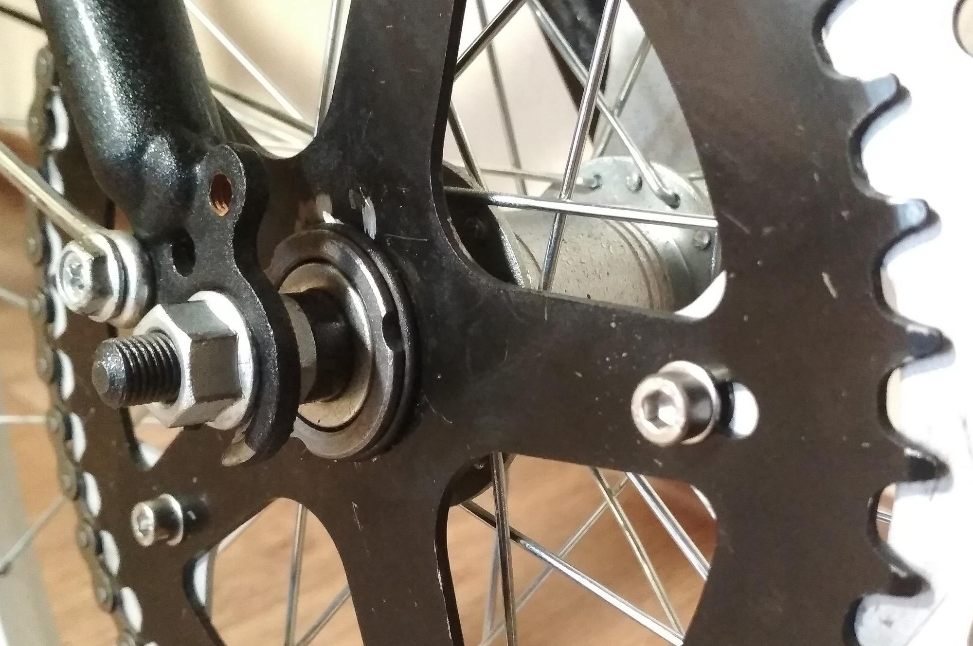 Впереди заднее колесо, вместо штатной звезды, поставил звезду от педалей 46 зубов, расточив отверстие в центре: