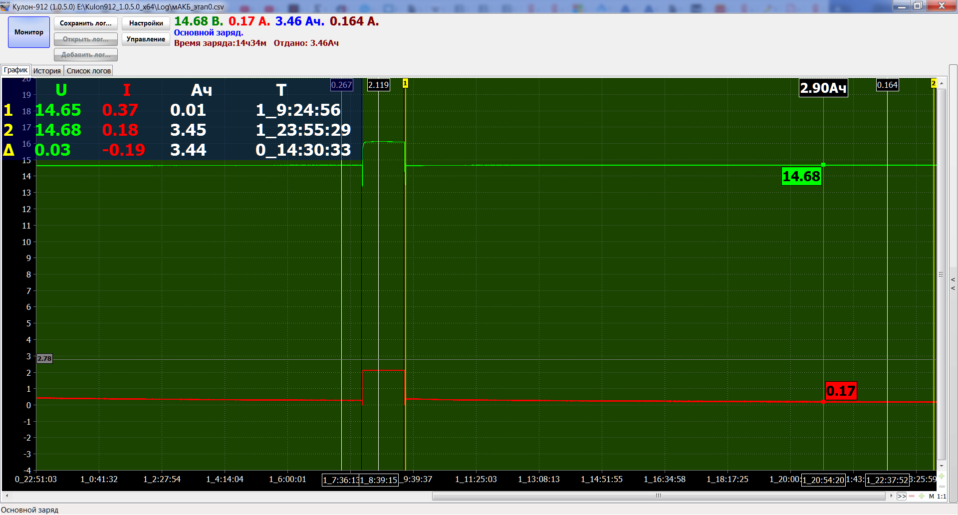 Время заряда:14ч33м Отдано: 3.46Aч