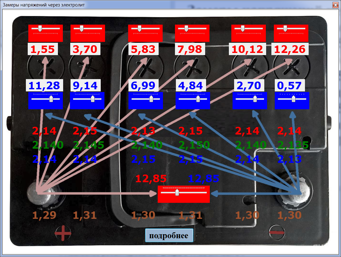 НРЦ=13,11v / 6 банок = 2,185v - 0,84v (потенциал пластин) = 1,345 г/см3