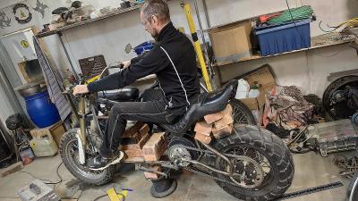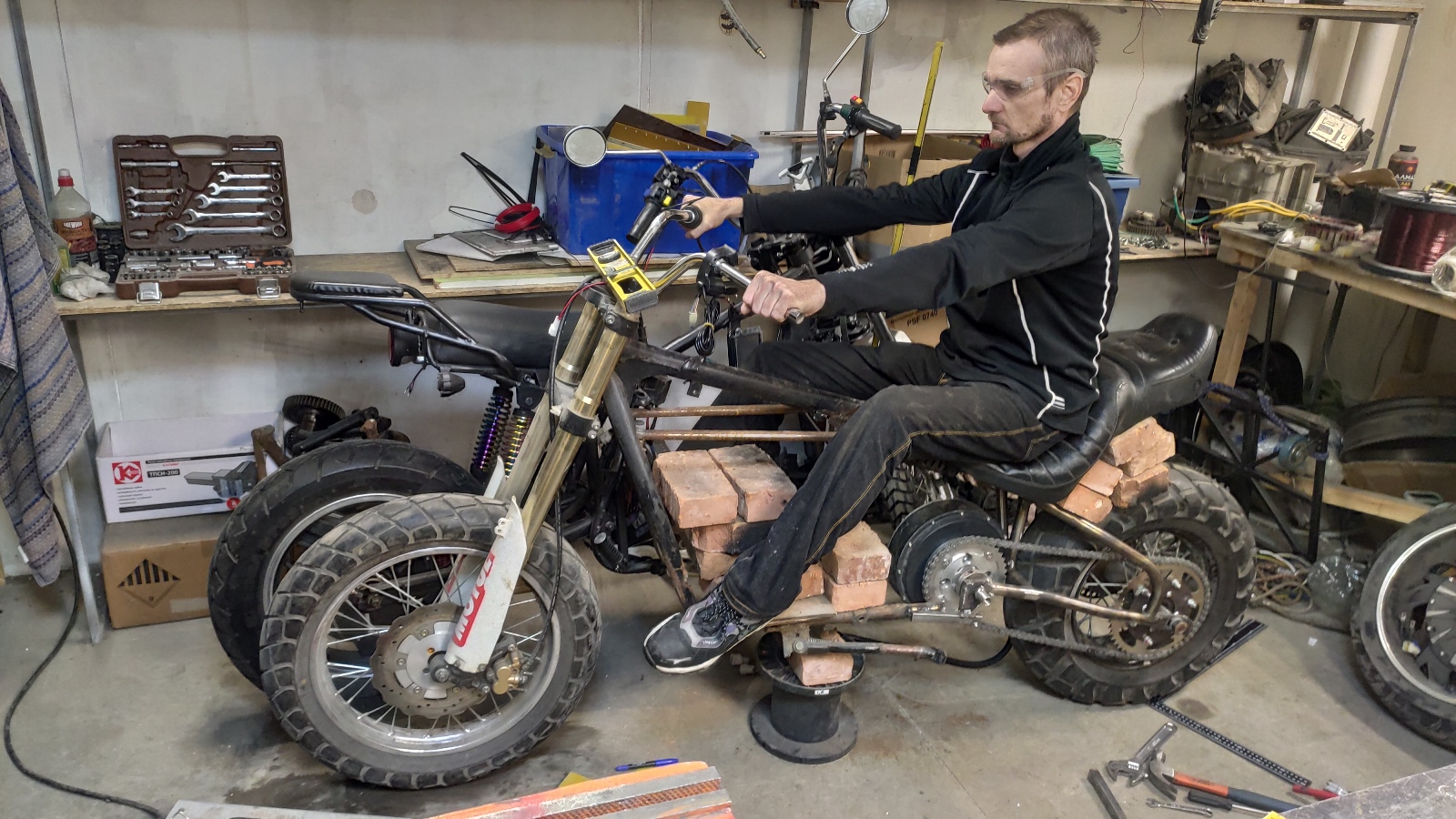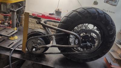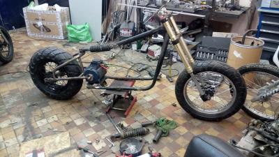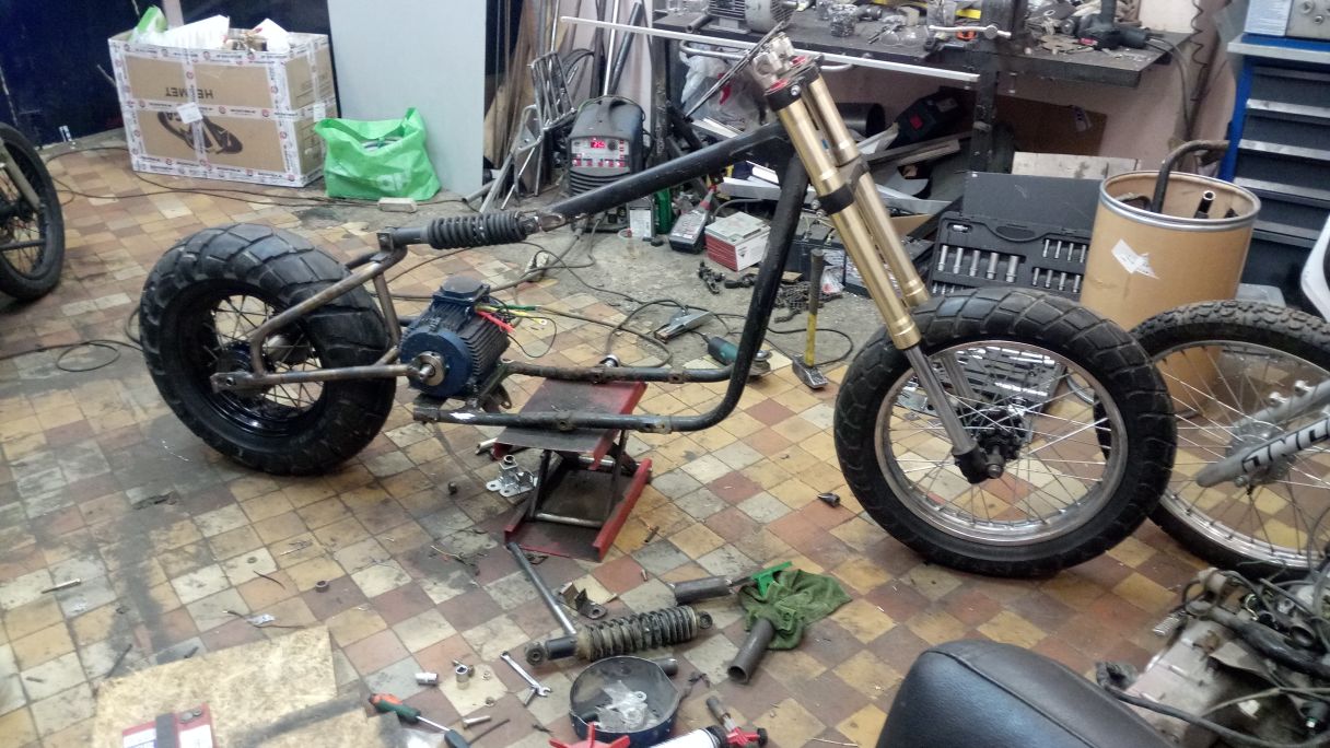 Начали прикидывать общий вид. Рама порезана, мотор уже переделан, вилка от 250 кубового кроссача, переднее колесо тоже сборная солянка из ступицы кроссача, обода 18" от Ижа и спиц от 19" колеса, заспицованных хитрым образом.