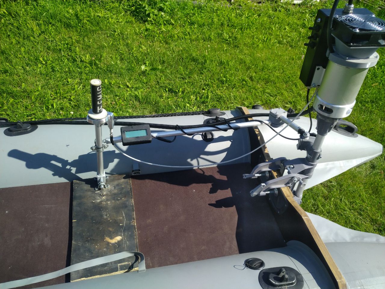 Собрал наконец "дистанцию". Делать решил наподобие того, как это сделано в педальных катамаранах - рычаг, который ходит вперед-назад и дергает мотор влево-вправо посредством жёсткой тяги. По некоторым причинам пришлось это делать наспех, и, разумеется, вылезли некоторые косяки при испытаниях. Например, если давить гашетку, а потом резко её отпустить - мотор складывается вперед набегающим течением. Потому газ надо отпускать плавно, и придумать прижимной механизм. Также доставляет неудобство то, что у руля нет четкого среднего положения, при котором лодка идёт строго прямо. Само управление тоже достаточно задумчивое в связи с габаритами лодки (4,3м), тем не менее,  достаточно удобно управлять стало, в отличие от первоначального варианта.
