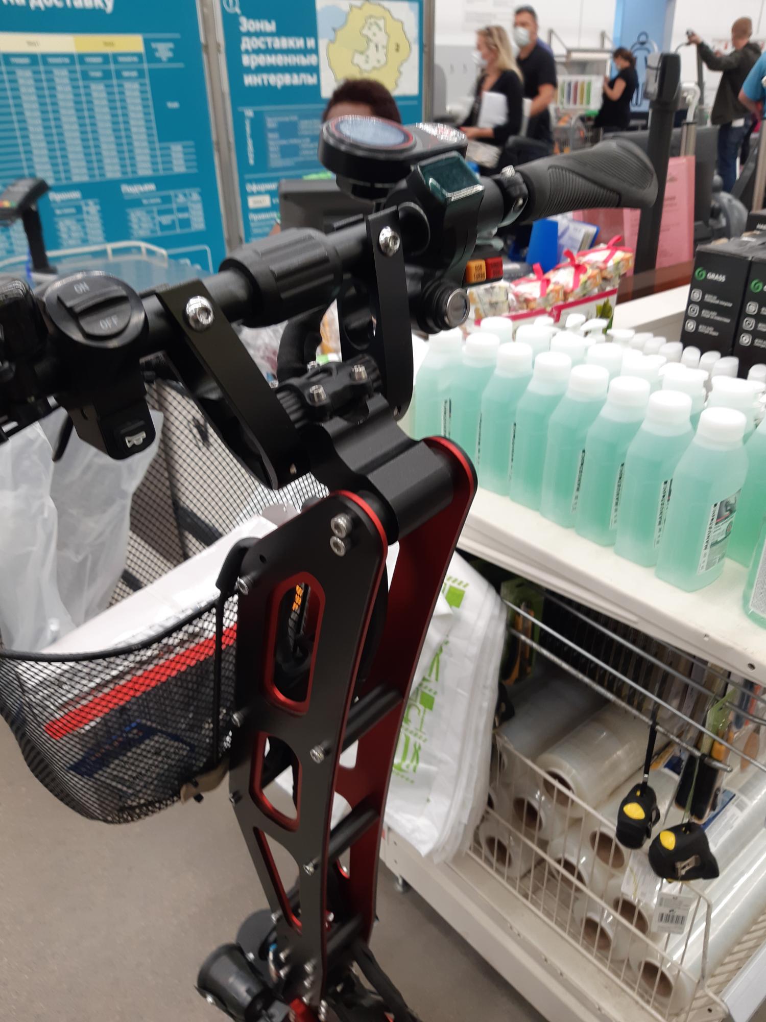 3. Самое главное: придумать как его поднимать на второй этаж. Лифт есть только пассажирский, а с сиденьем и багажником, самокат потеряет функцию складывания. Проблема не в его весе, а в том, что спереди просто ухватиться не за что. Значит нужно придумать какую-то ручку спереди.