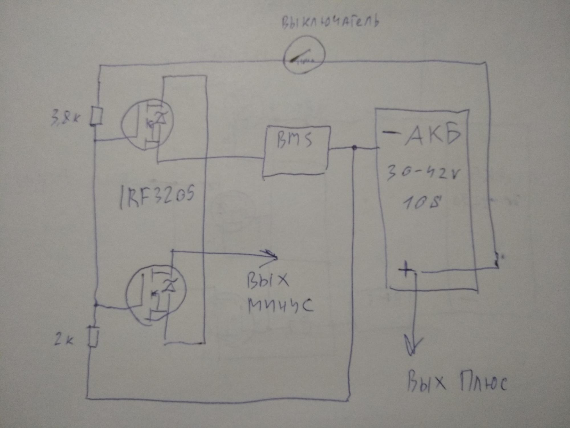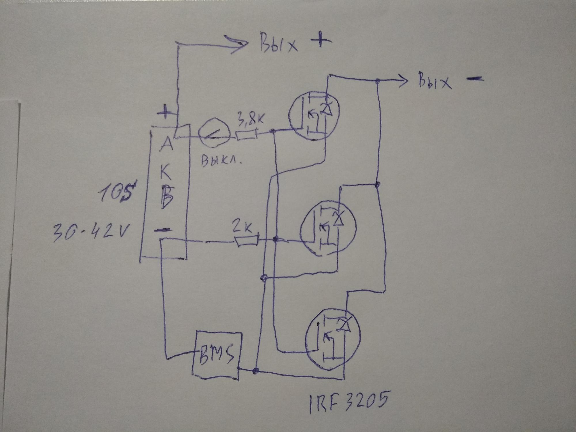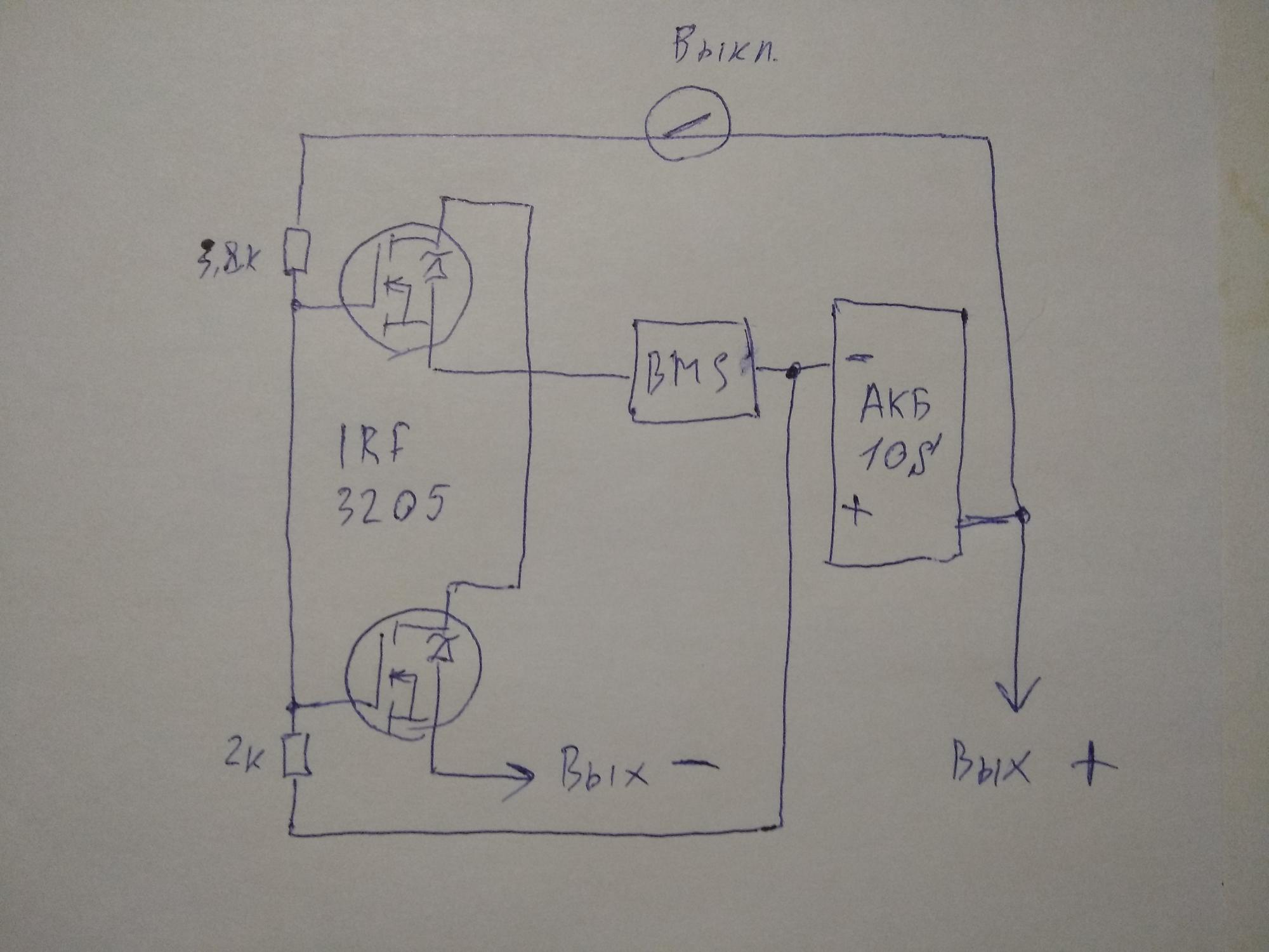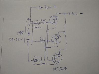У меня в разрыв минуса после BMS. Моя схема с тремя транзисторами в параллели.  Рабочая! Вторая схема ваша- переделанная. Будет работать? как думаете?