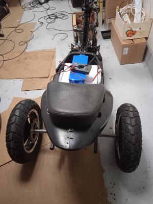 Был бензиновый мопед,я снял с него мотор и занее колесо и удлиннил раму на 60 см туда вставил ось 90 см .В передние амортизаторы вошло электроколесо 10 " .Под сиденье поместил 5 акумуляторов самодельных литиевых 12.6 вольта. 300 элементов 18650 .задние колеса 12".на 4 подшибниках вращаются.Ось неподвижная.Особо с переделкой не парился.