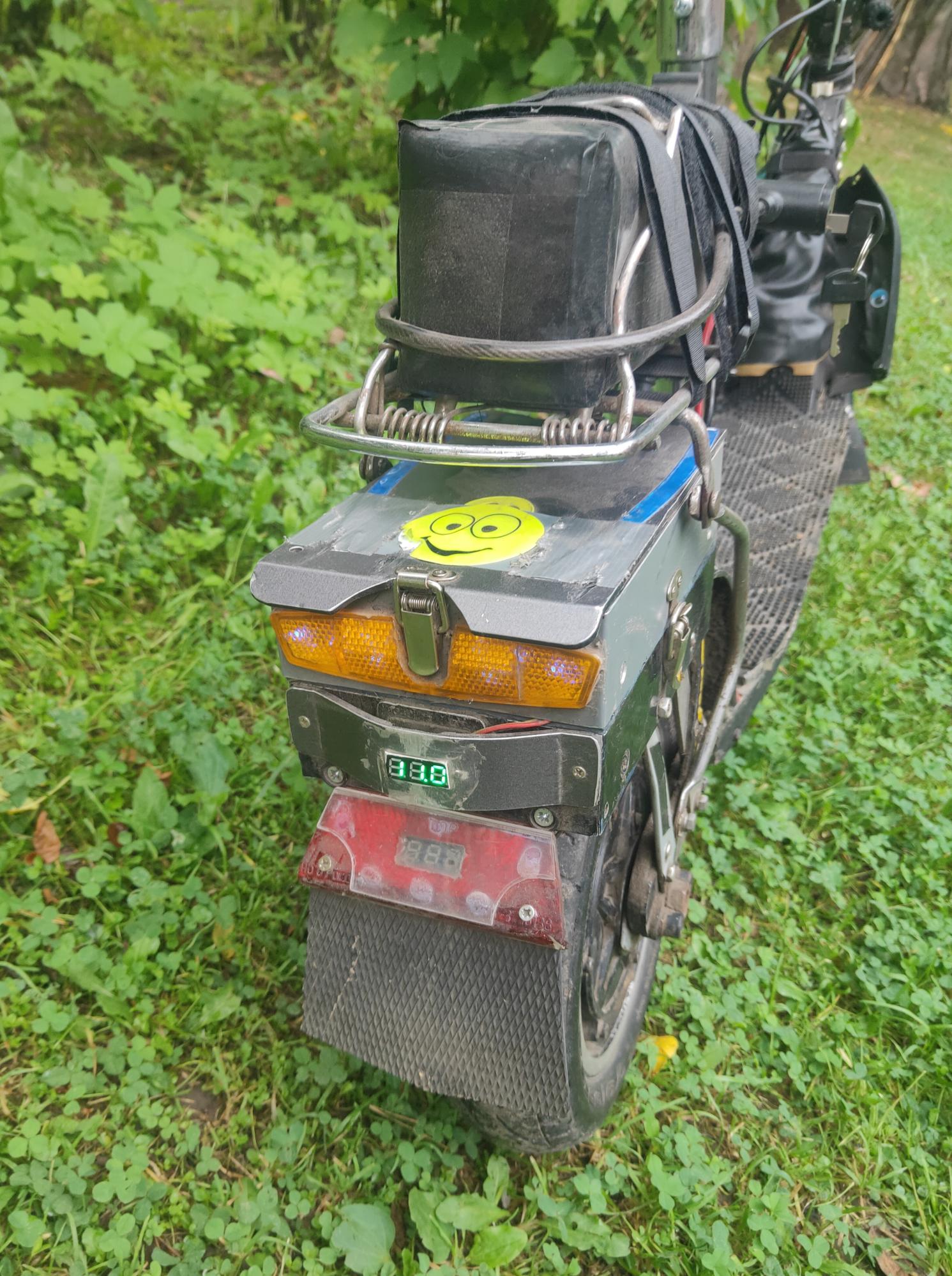 Заднее крыло под такое моторколесо пришлось переделать конкретно, а так как с гириком достался и новый акум, то сделал туда и коробок из того же алюкобонда под него. Там еще габаритный свет и тормозной сигнал. Тормоза моргают тремя 0. Это красный вольтметр   от 0 до 100 вольт. Достаточно внятно нолики объясняют действие. Сверху еще багажник, так просто, но по сути для батарейки 10s4p. Кроме этого у меня на этот багажничек сделан и коробок под две такие батарейки. Тогда 4 батарейки на 130 банок дадут пробег не меньше 70км. Пока не решил, буду ли ставить, но всё есть.