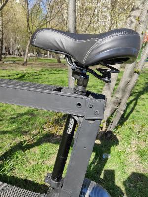 Стойка седла сделана из пневмопатрона и каких-то подходящих по размеру трубок. Отрегулирована под вес моей жопы. Мягко и комфортно.