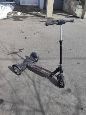 Сегодня дочкин(9 лет) самокатик. Кроха. Самый востребованный в семье. Полноприводный. Едет со мной больше 30км\час. Дури за глаза. Зимой по снегу гребет запросто. Батареек 2шт. Одна на 20 банок в урезанной под мою ступню(41) деке, вторая такая же, но быстросъёмная, на гусе. Этот год еще отъездят. Я его беру, если мне куда надо на метро. Там его не замечают даже в толчее, хоть и не складываю.