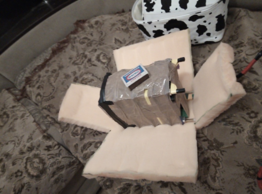 Затем из 2-х см поролона вырезаем по размеру крест, пеленаем в него батарею,