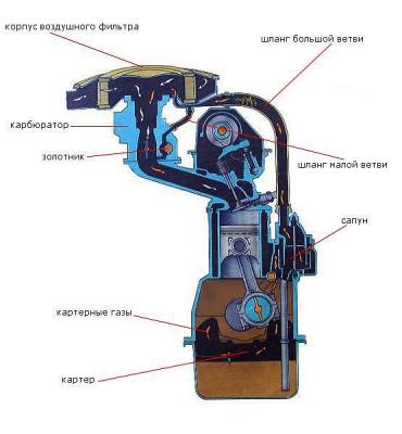 Да, всё именно так и есть, пары бензина проходят по шлангу вентиляции картера через карбюратор. )) Я удивляюсь, почему ты не знаешь этих азов?