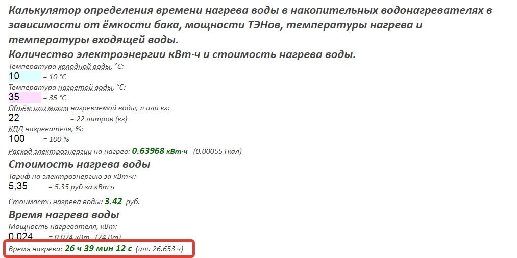 Мощность ТЭНа в  24 Вт прогреет объем воды 22 литра (22 кг) на 25 градусов  за 26,6 часов