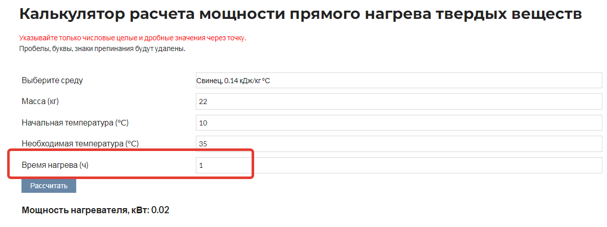 Дальше, для расчета нагрева разных веществ нужно учитывать их теплопроводность. А вот она у свинца и воды сильно отличаются (раз этак в 60 в пользу свинца, насколько я понимаю). Я сам в физике не силен, но можно найти калькулятор и на такую специфическую задачку как нагрев свница весом 22 кг. на 25 градусов нагревателем в 20 Вт. По нему получается нужен всего час, а не 90 часов.