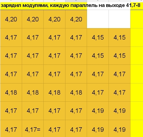 Еще процесс идет. Минимальная параллель до чистки контактов 4.07 была, максимальная 4.19. Остальные 4.09/4.11/4.15/4.16. Но это до чистки. Параллель на которой было 4.11и зеленый диод до чистки, после чистки зарядилось до 4.18в. Как все заряжу табличку нарисую. Не дают дела семейные спокойно позаряжать :run: то внучки в гости пришли, то собака орет на улицу хочет. Оставлять без присмотра не хочу, поэтому не быстро у меня получается :pardon: