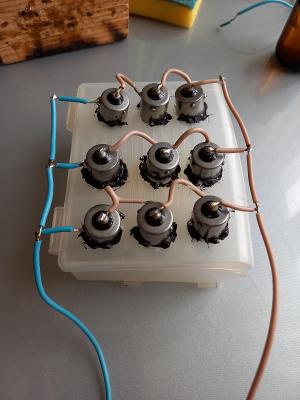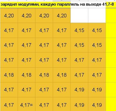Всем доброго времени суток.  Ну вот продолжение. Зарядил я модулями tp4056  каждую параллель, так как зарядки было всего три , то приходилось переставлять и пока следующие заряжались, предыдущие просаживались на сотые доли. Самое высокое напряжение сразу после отсоединения модуля на паре параллелей, было 4.22, самое низкое 4.18. На выходе с батареи перед подсоеденении лампочек, напряжение было 41.7-41.8.