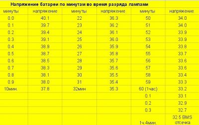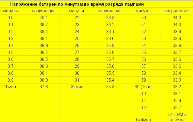 Как подсоединил лампочки и мультиметр на выход с батареи, напряжение с  41.7 опустилось моментально 40.1 (на нулевой минуте), дальше как менялось на фото, bms дало отсечку на 32.5, по времени 1час 4 мин..