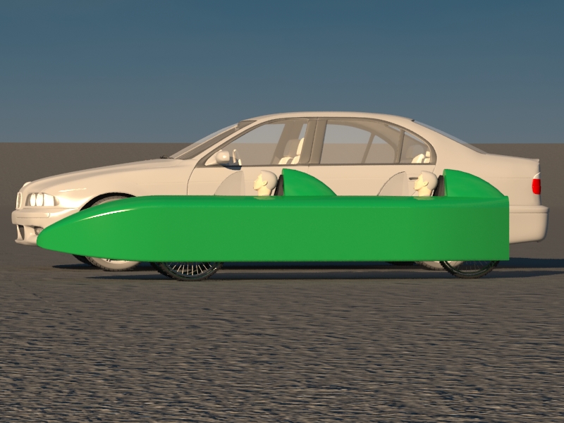 На основании этого веломобиля смоделировал 2-х местный крейсерский веломобиль :) Теоретически, такой должен только на педалях километров 45-50 в час ехать. Сопротивление качению должно стать больше раза в 2, но аэродинамическое сопротивление, что самое важное, если и вырасло, то незначительно.