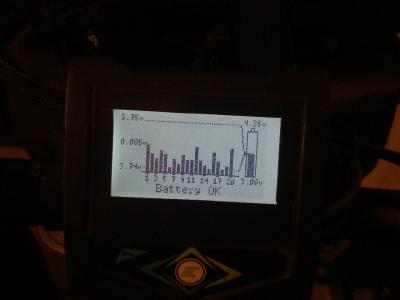 75% разряда, внутренее 100...75мОм в зависимости от температуры батареи 25°... 50°, разбег 5мВ (3.64v)...14мВ (4.35v)