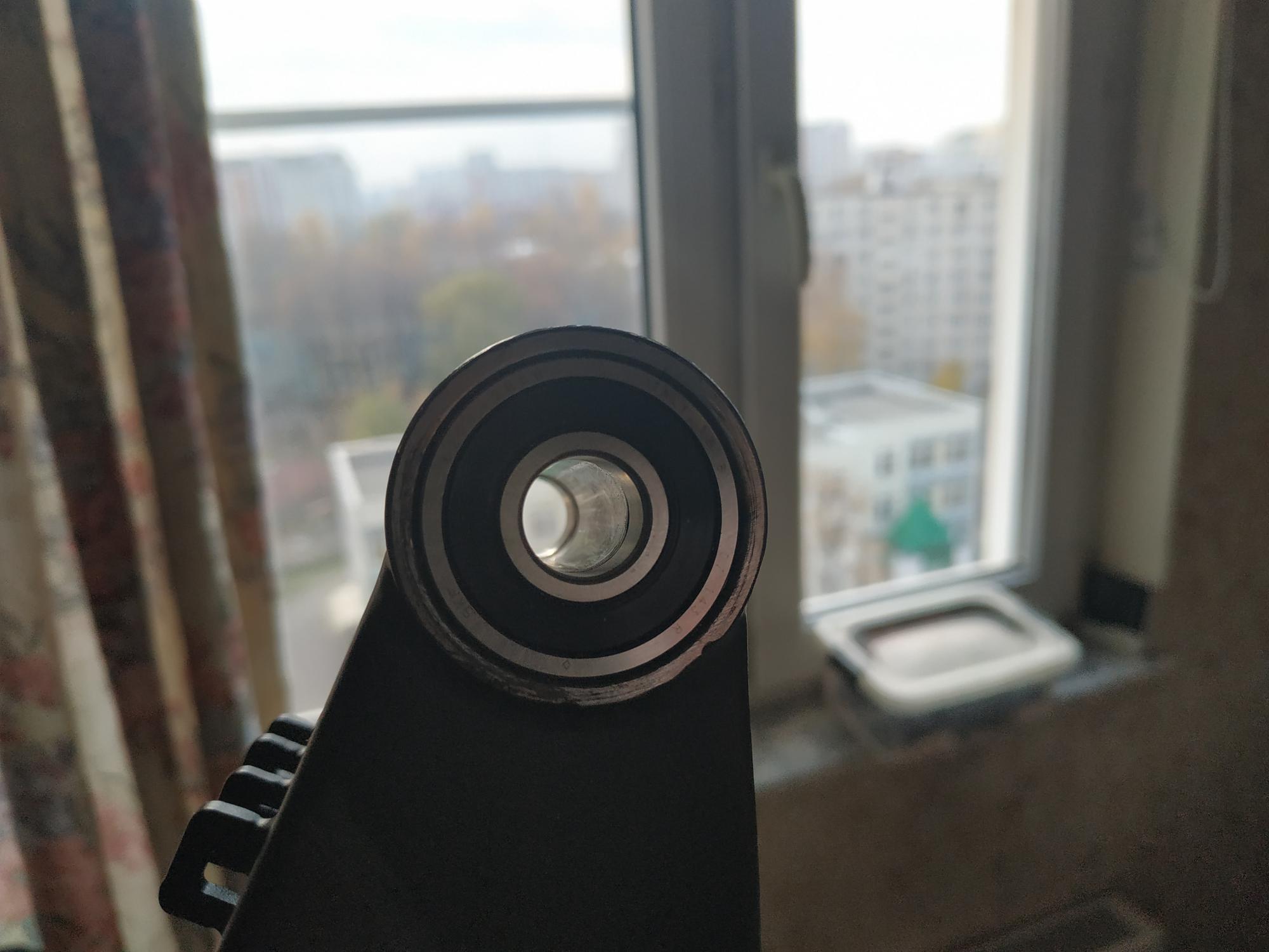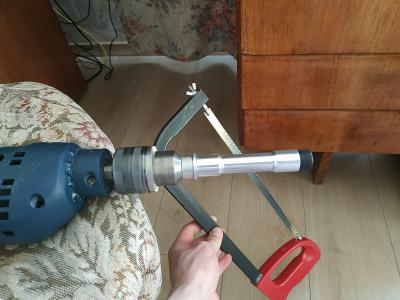 из косяков - распорной втулки подшипников маятника в комплекте не было, пустил под это дело не нужный переходник с 20й оси на эксцентрик. Токарника пока нет, поэтому пришлось импровизировать из дрели и ножовки по металлу для ровного реза. Получилось. Подшипники SKF 6201 2RS, 250р штука в ближайшем автомагазе. Ось - болт 120мм с отпиливанием лишней резьбы. Болт прослаблен в подшипниках, по скольку М12 там весьма условная - по факту 11.8мм Пока походит, потом подумаю, может точну более прецензионную ось