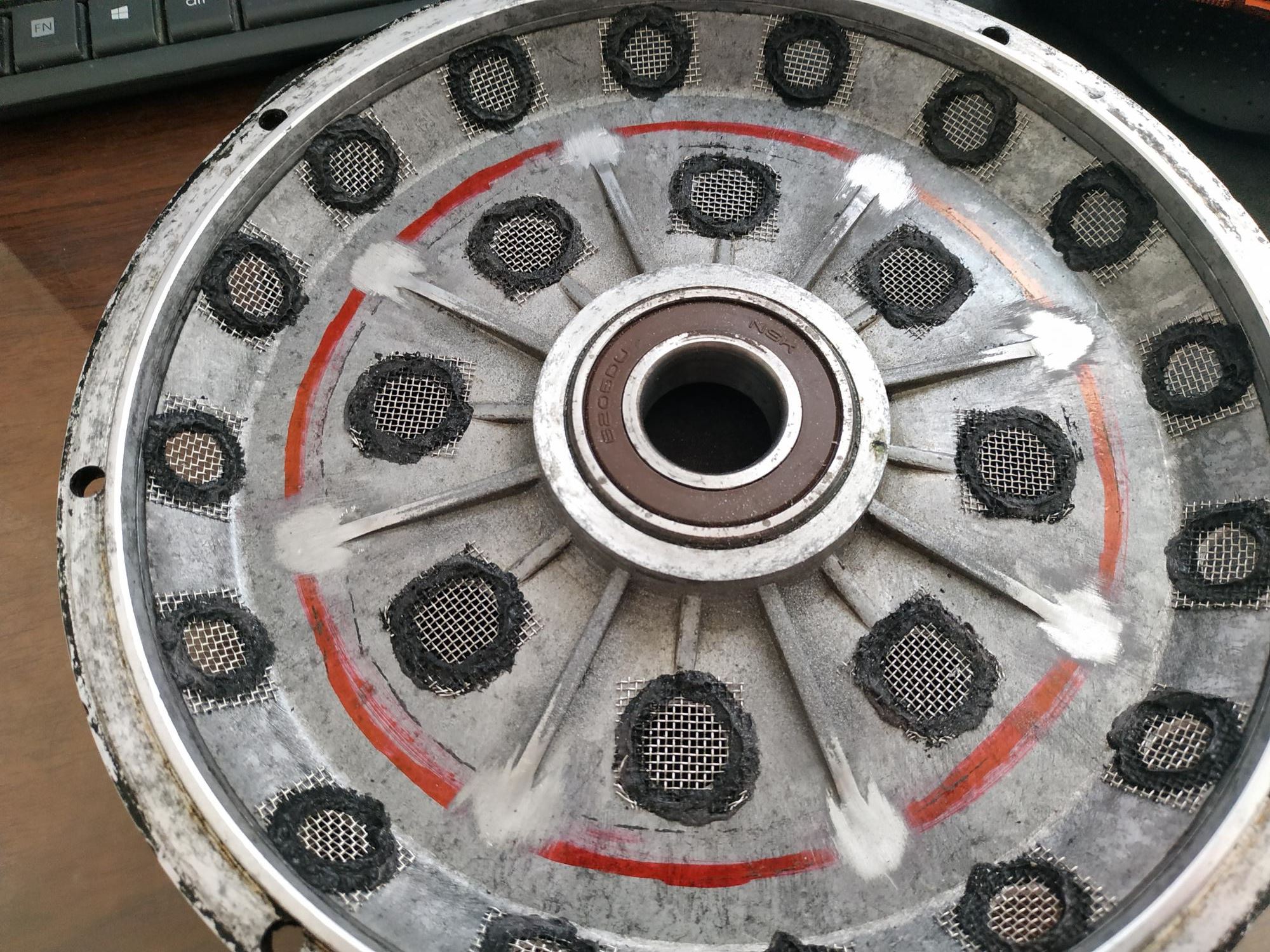 Сажаем на герметик защитные сетки, шлифуем ребра по месту трения будущего кольца и вклеиваем кольцо в статор (годится только вспененный каучук) Белое - сухая оружейная смазка Forum. Поясню за материалы: по исследованиям Чупы, место стыка кольца с крышкой на скорости в 80км\ч нагревается примерно до такой же температуры. Любой другой материал, кроме резины, тупо поплавится. Если он поплавится - появится зазор и эффективность моментально сойдет на нет. Если кто еще не понял принципа работы - в центре всос воздуха, сзади он ударяется о глухую крышку и выходит назад уже в щель между статором и магнитами + зазоры ламелей. Соотвественно если разделитель потоков будет плохо выполнять свою функцию, возникнет прямой подсос горячего воздуха в зону холодного. По поводу смазки - любая мокрая насосет в себя пыль и станет абразивом. Поэтому только сухая.