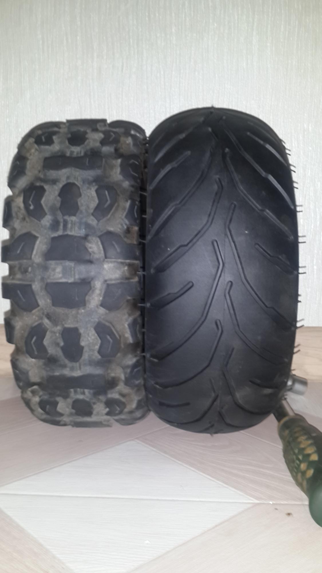 Две покрышки с одинаковыми обозначениями  90/65-6.5, но разными размерами.