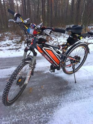 В теории, зубастая покрышка на мягкой морозоустойчивой резине фэтбайка, шипов не требует. Ну, по крайне мере, для тех дорог, по которым я езжу зимой. Везде реагенты и преимущественно плюсовая температура. Что характерно для современных московских зим.  ;-D