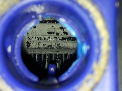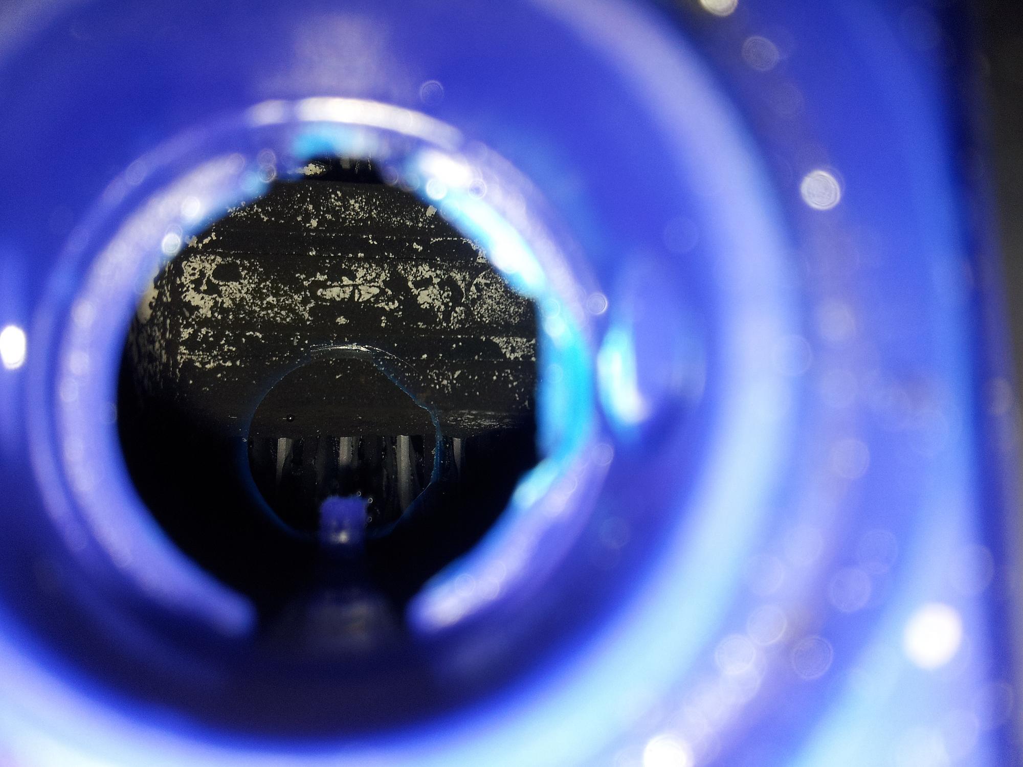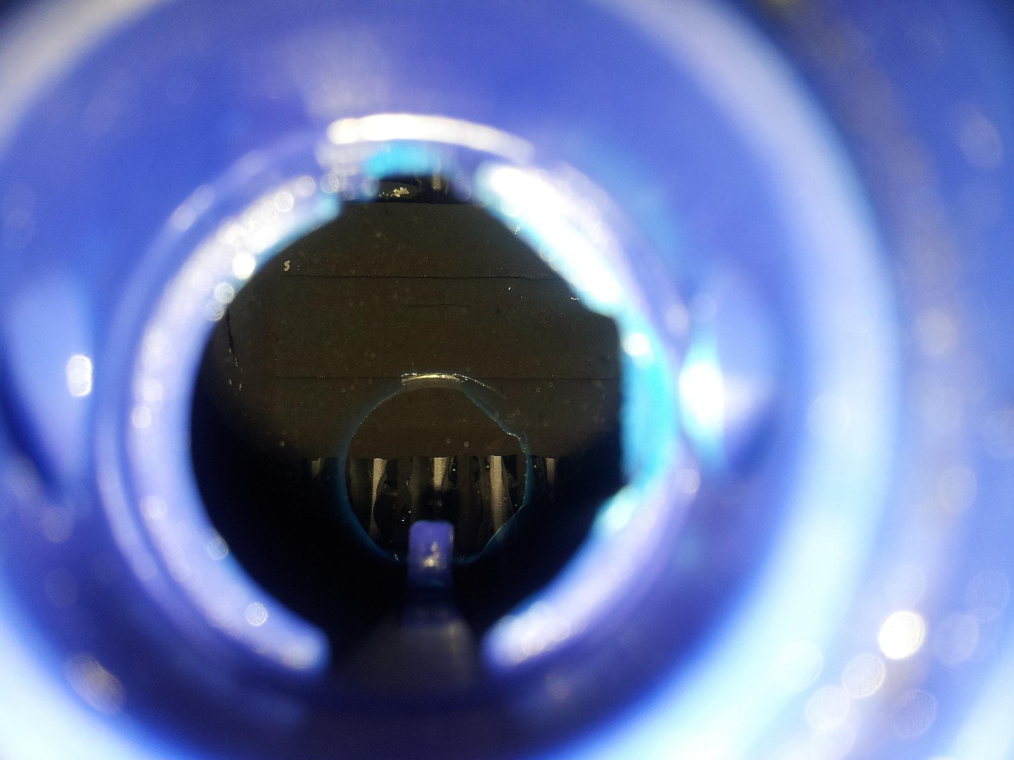 Наглядная картина работы-лечения "Версия4(ТОР)". Всего после двух ктц, налет-сульфатация на минусовых банках полностью растворился. Напряжения в паузах во время добивки плавно снижается до 13,6 и ниже  не падает. Фото одной и той же минусовой банки. Фото 1е до работы ЗУС, 2е после 1го ктц, 3е после 2го ктц.