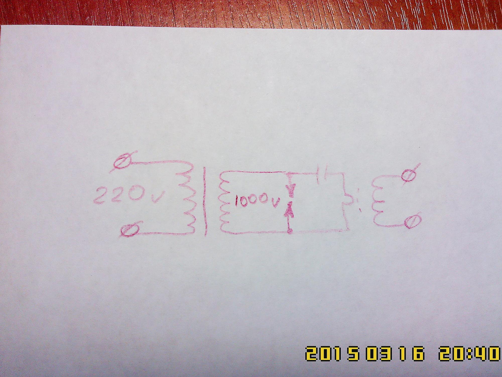[user]TRO[/user], Вот схемка. Транс ватт на 200 плюс- минус пофигу какой, на вторичке килововольт, можно чуть больше. Особо обратите внимание вольт-амперная крутопадающая (я-бы даже сказал очень, очень крутопадающая), так как вторичка будет работать на к.з. Разрядник можно из свечи, но лутше из двух вольфрамовых электродов с плавной регулировкой зазора. (это очень просто) Зазор примерно 0,5-0,75мм. Кандёр не помню какой нужен, у меня стояло 5шт. 2мф-250в от совковых люминесцентных ламп, соеденённых последователльно. Выходной транс на ферите (у меня от кинескопа): первичка 1виток, вторичка 8витков шиной 25 квадратов.