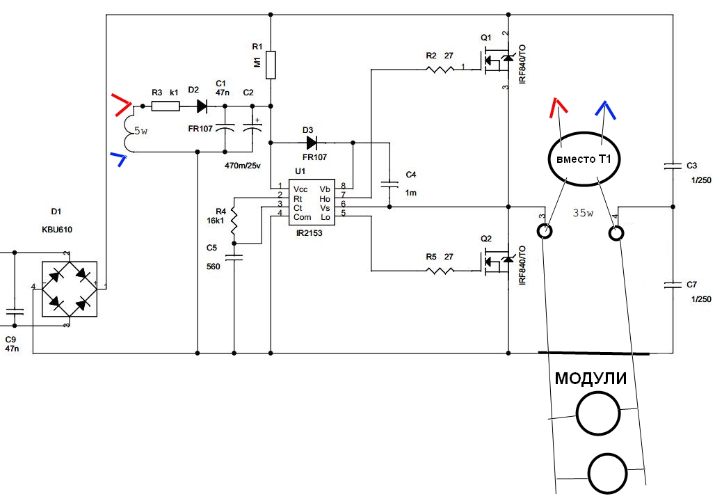 Далее подключаем линию модулей (они включены все параллельно) к точкам, на схеме - 3 и 4 туда, где была первичка Т1 (к этим точкам  тоже подключена первичка трансика запитки IR2153).. так?