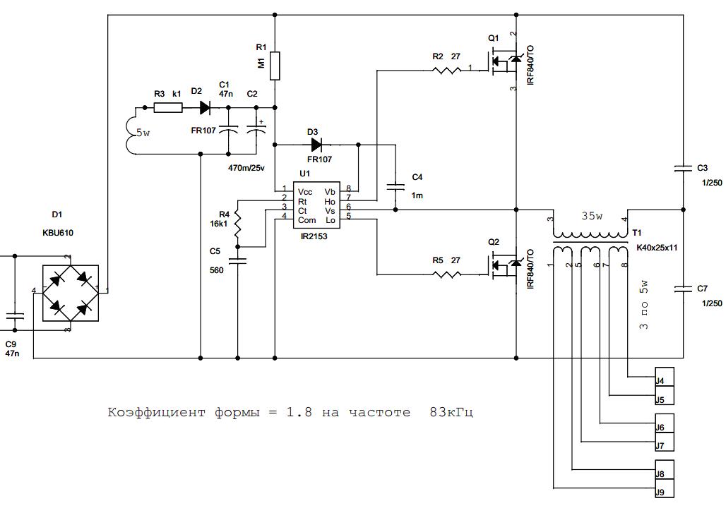 Т.е.  Т1 выбрасываем, вместо него ставим колечко с первичкой - 35 витков,  и на вторичке - 5 витков, с этой вторички идет запитка  IR2153 самого блока питания.